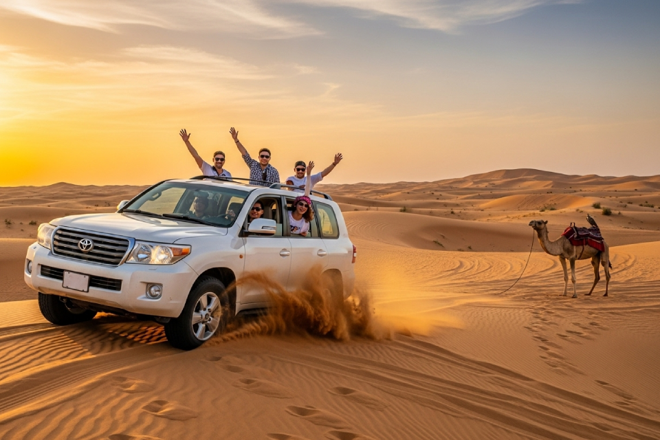 • Desert Safari with dune bashing, sand boarding, camel ride, dance show, live BBQ & buffet dinner.